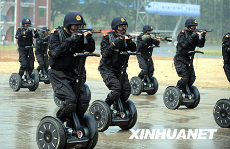 武警战士在演练借助单兵突击车迅速布控。武警战士在演示火焰喷射枪。...